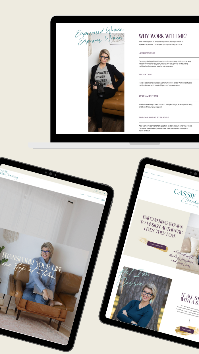 Cassie Tebo is a life coach, mentor, and serial entrepreneur with over 15 years of empowering women. From losing 140 pounds to building multiple businesses, including a successful photography brand, she knows what it takes to create change that lasts. As she transitioned into coaching, mentoring, and training, she needed a brand and website that communicated her experience, differentiated her from her photography work, and brought all of her services under one cohesive home.